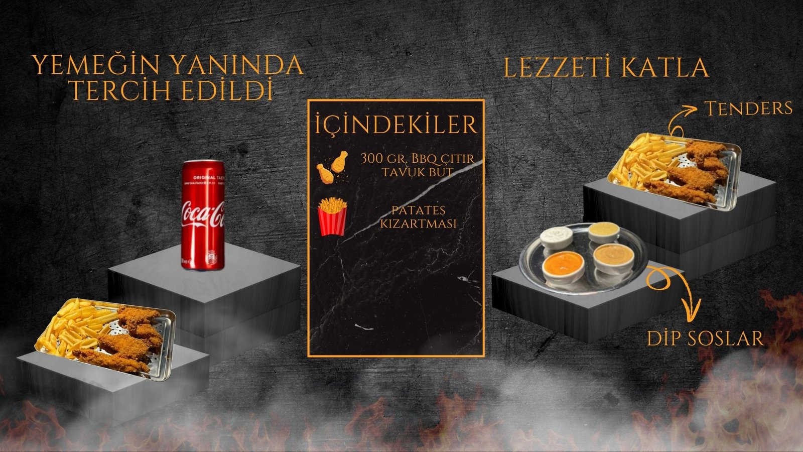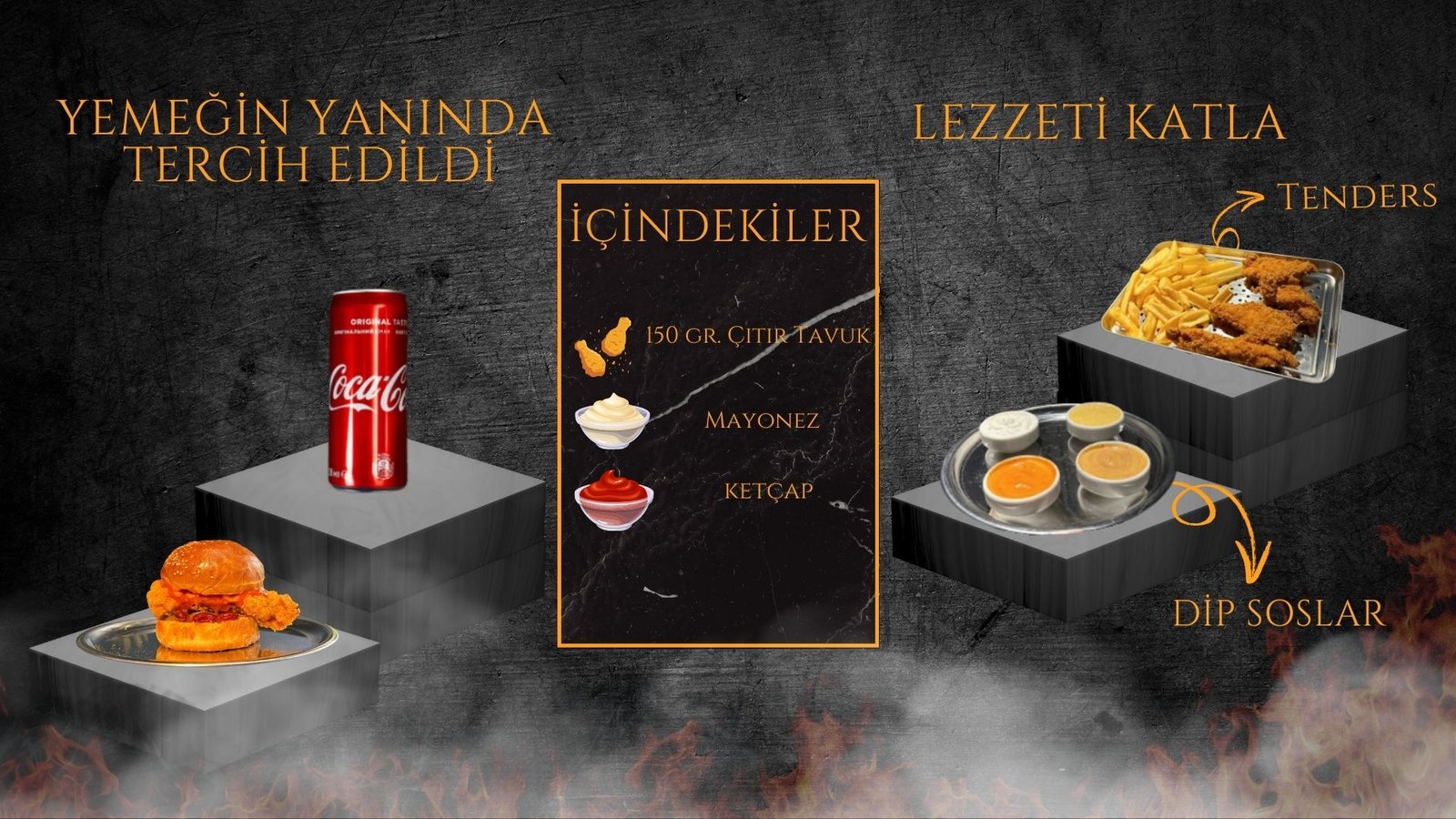 Seçeceğiniz hamburger, seçeceğiniz tenders, kanat ya da but
