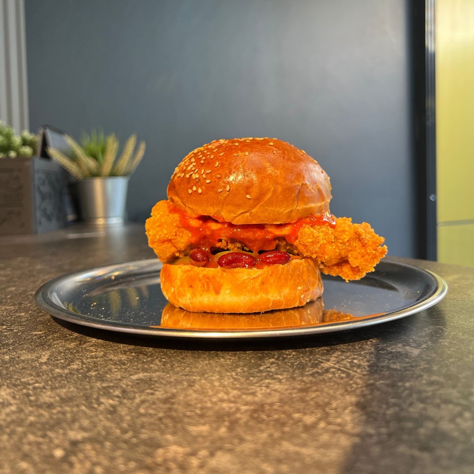 300 gr. çıtır tavuk, özel burger sos, domates, cheddar, Alman turşusu
